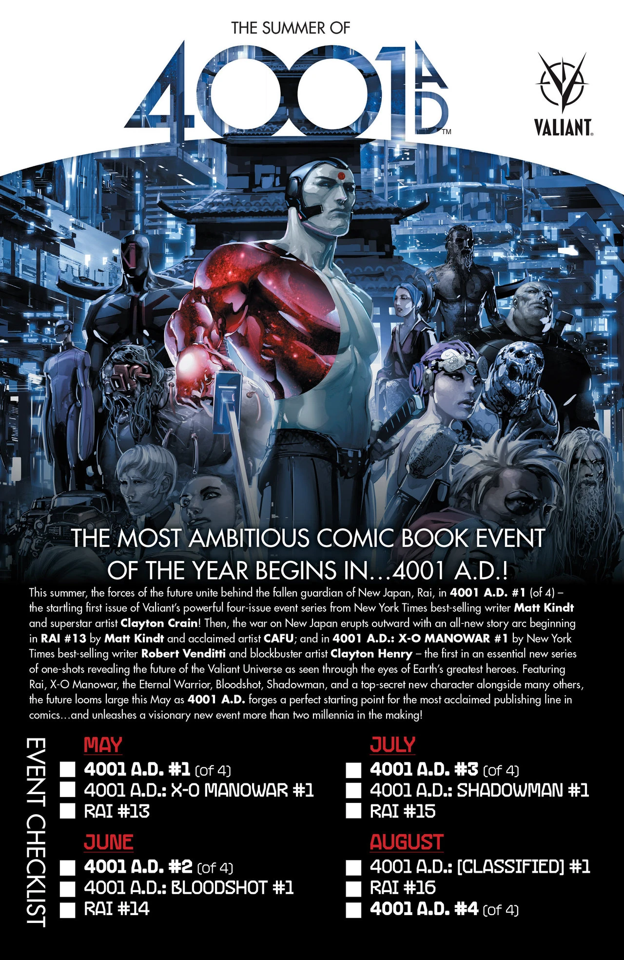 4001 A.D. is a crossover event published by Valiant Entertainment in 2016. The core series is written by Matt Kindt with illustrations by Clayton Crain. The event also includes tie-ins with the ongoing Rai series, and several one-shots focusing on future incarnations of Bloodshot, Shadowman, and the X-O Manowar Armor, as well as the new character War Mother.