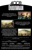 4001 A.D.: Shadowman #1 is one of four tie-ins to Valiant's crossover event 4001 A.D.. It is a self-contained story focusing on the role of the Deadside in the 41st Century of the Valiant Universe. It also features a future incarnation of Shadowman's loa.