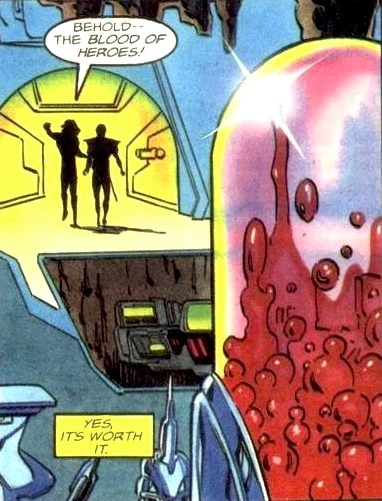 The story of the legendary "Blood of Heroes" started with the young Geomancer Geoff McHenry. At the end of the Unity conflict in the Lost Land Geoff was determined to discover what his fate would be should he survive Unity. He located Mothergod's computer from the 41st Century to find his own history files showing that Geoff, upon his return to the present day, would enter a secret Project Rising Spirit facility and liberate Bloodshot, the first subject with nanite-enhanced blood granting him super-human abilities. [1]