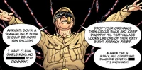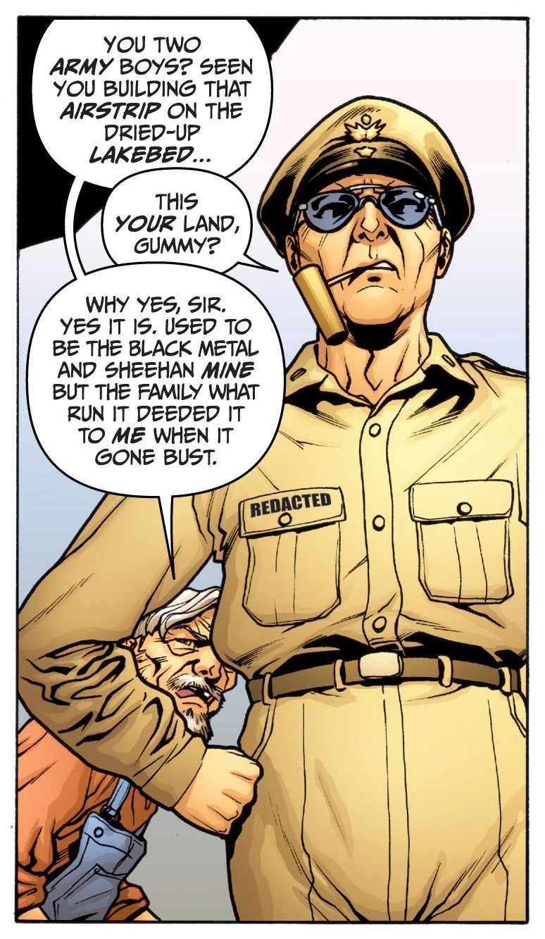 General Redacted is a member of the secret military organization Project Rising Spirit. He accidentally stumbled into the Faraway, a realm that makes its residents immortal, and stayed there for decades while in constant contact with Rising Spirit. His warmongering would eventually make him an enemy to the adventuring duo Archer & Armstrong.