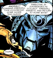 Anomaly! Scanning Freewill-type Positronic core inside this human. Directive 3,1 supersedes 1.0. Collect Freewill targets and return to home base.