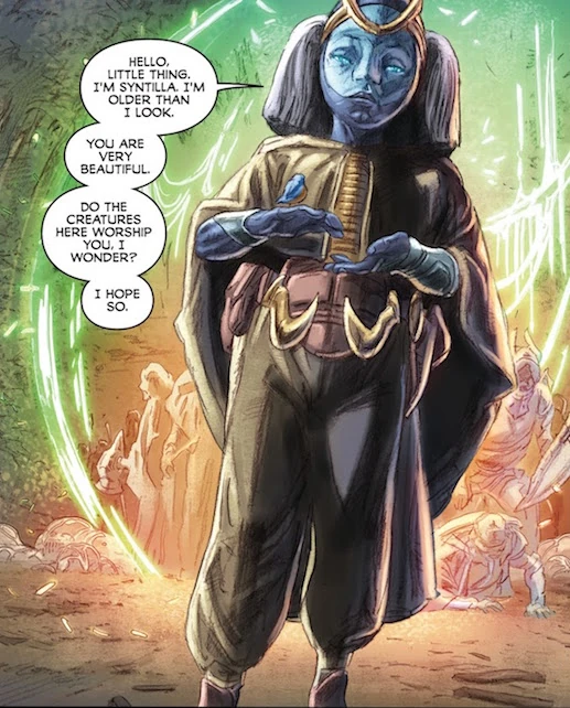 Syntilla is an alien necromancer with mysterious abilities who is under the influence of Imperatrix Virago. According to herself, she is much older than she looks.